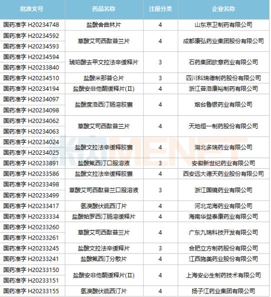 在过去的2023年,国内共有18家企业的抗抑郁药(涉及13个品种)获批生产,并视同通过一致性评价。其中,石药集团的琥珀酸去甲文拉法辛缓释片、安徽新世纪药业的盐酸氟西汀口服溶液为国内首仿;3个品种为国产第2家,包括四川科瑞德制药的盐酸米那普仑片、浙江国镜药业的草酸艾司西酞普兰口服溶液、江西施美药业的盐酸氟西汀分散片。