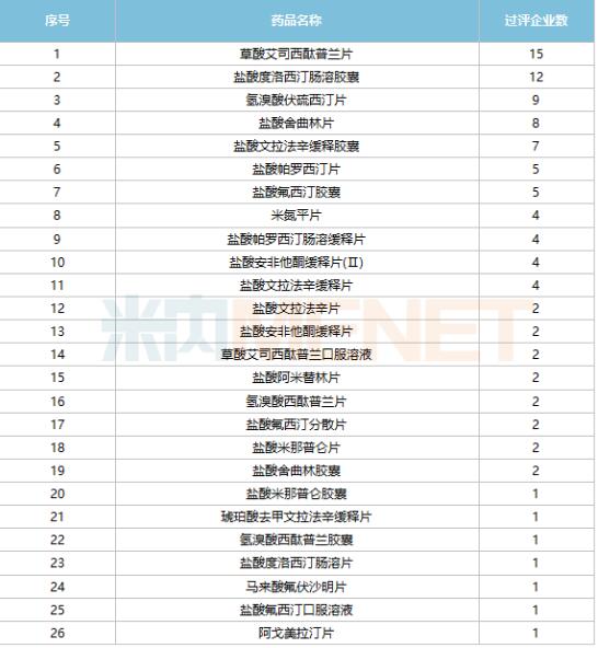 截至目前,抗抑郁药已有26个品种通过或视同通过一致性评价。其中,复星(含重庆药友、洞庭药业)以5个过评品种领跑,康弘药业、华海药业各有4个品种过评,科伦药业、石药集团、福元医药、上海医药等4家各有3个品种过评。